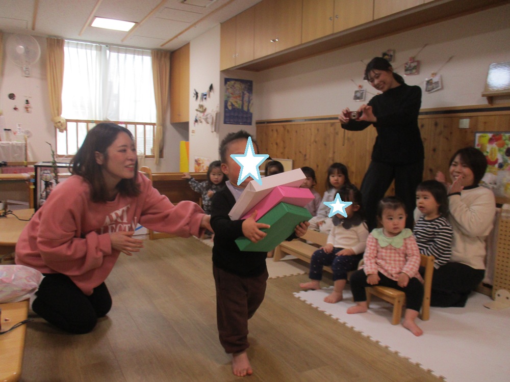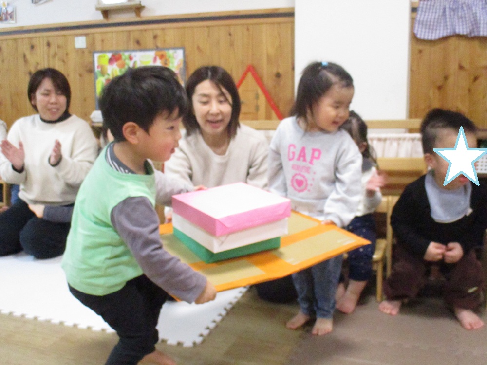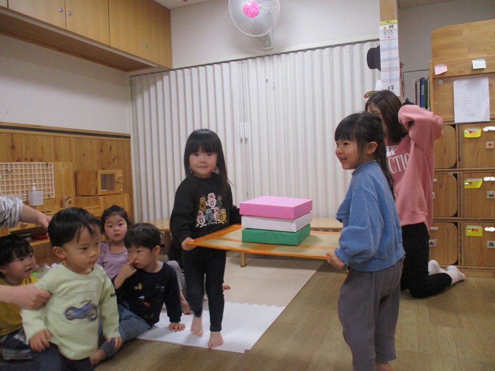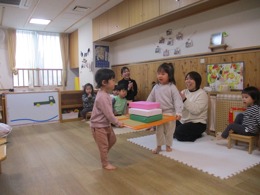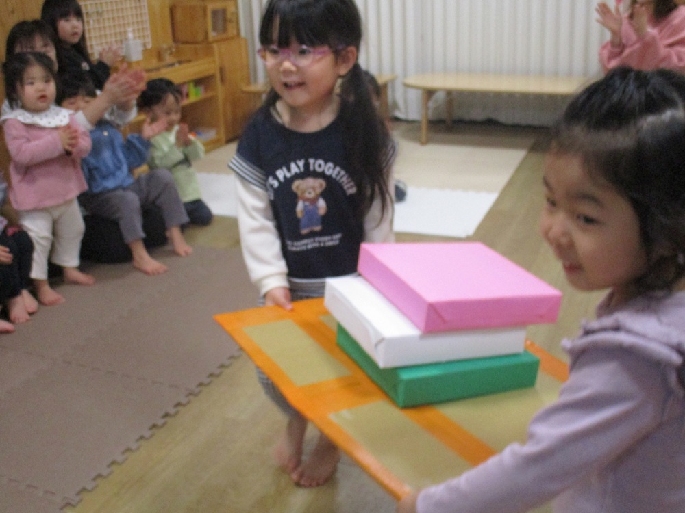 さくら組さんにとっては最後のお楽しみ会になるということで、久保田先生が笑顔いっぱいで過ごせるようにと「ひしもち運びゲーム」を考えてくれていました⭐