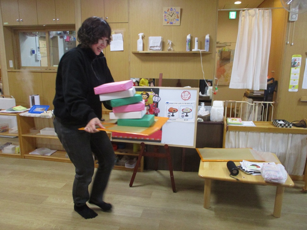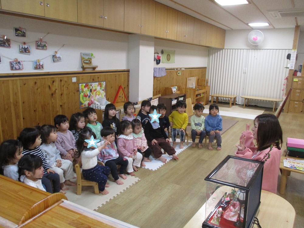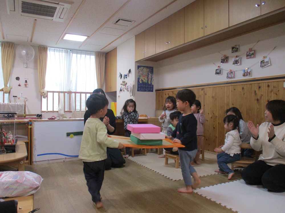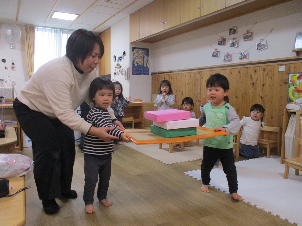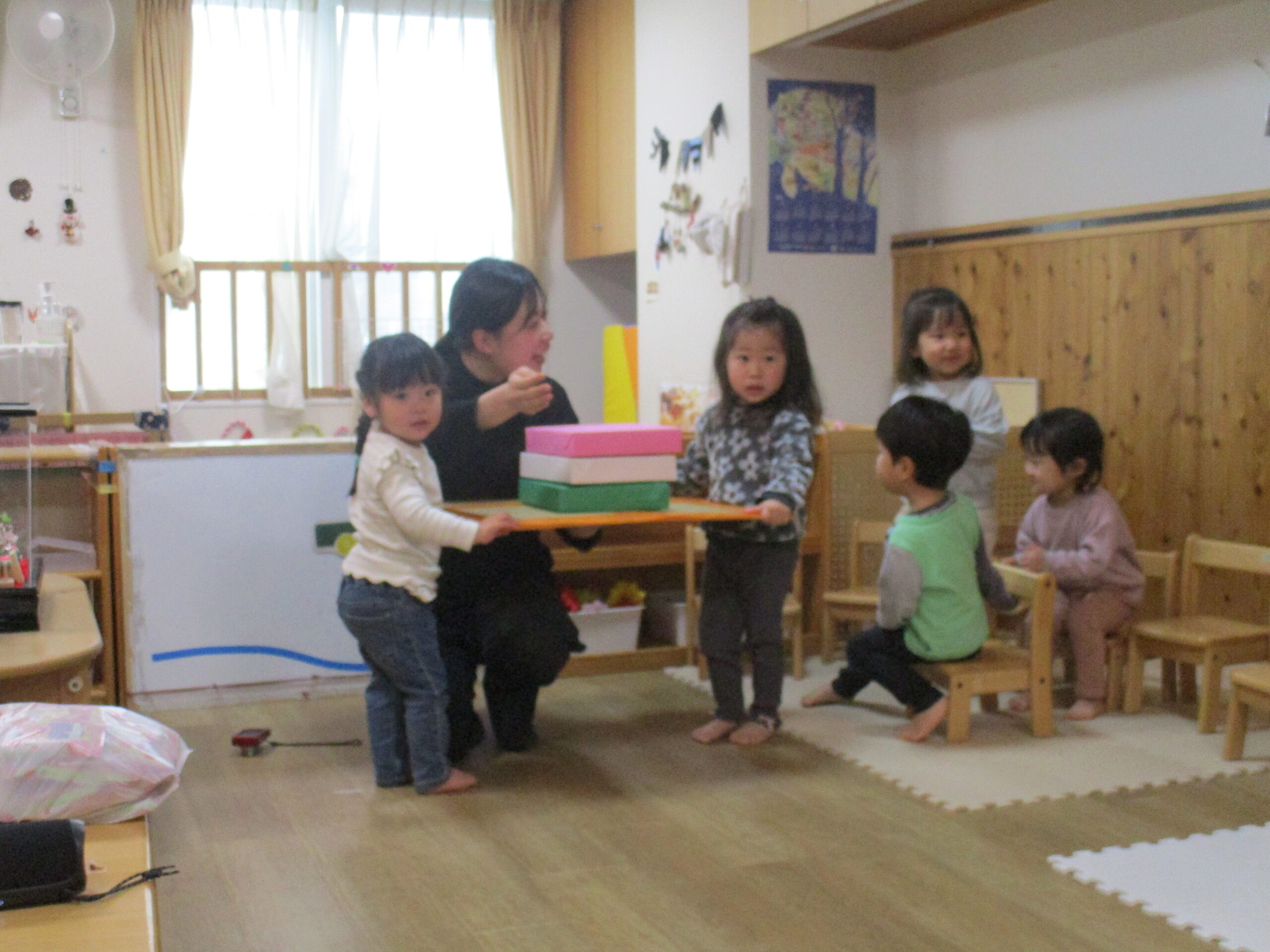 さくら組さんにとっては最後のお楽しみ会になるということで、久保田先生が笑顔いっぱいで過ごせるようにと「ひしもち運びゲーム」を考えてくれていました⭐