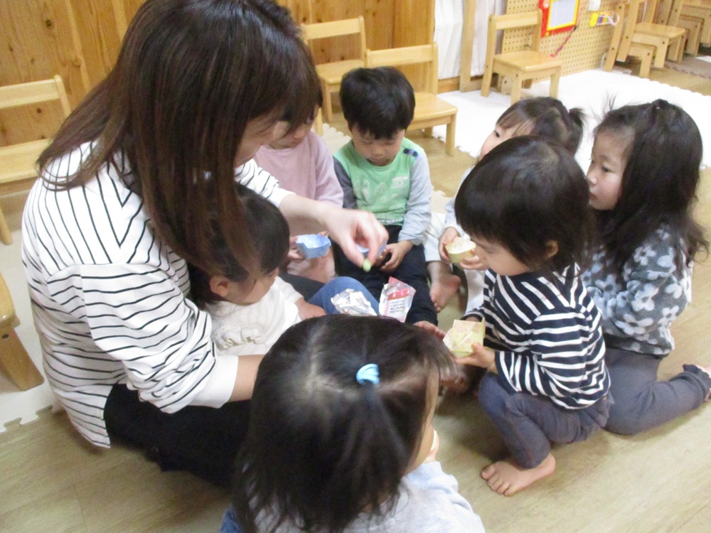 「しろはゆき~!!ピンクはもものはな~」と、さくら組さんはつぶやきながら食べていましたよ💛